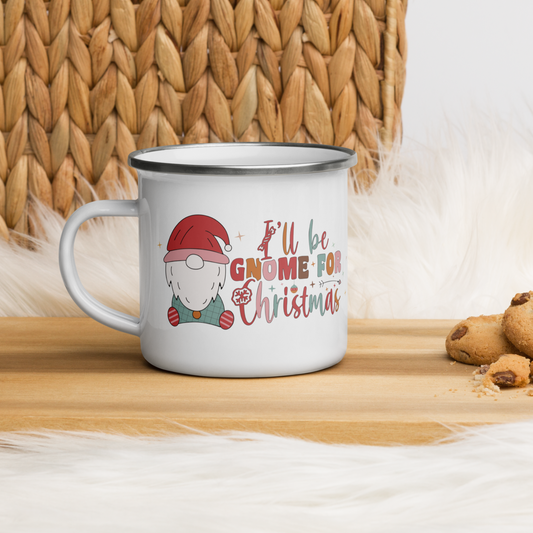 I'll Be Gnome for Christmas Retro Style Mug White Enamel Hot Cocoa Drinkware Indoor Outdoor Mug 12 oz