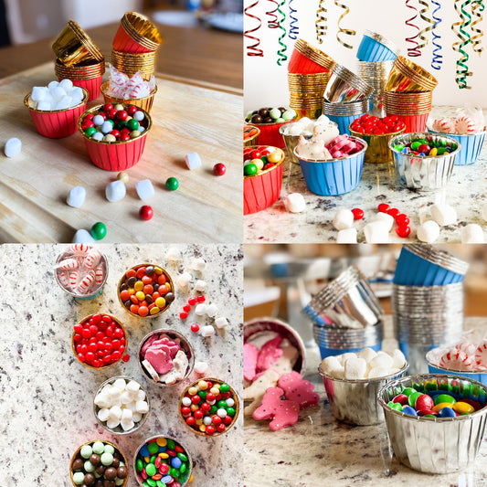 Blue, Silver, Red and Gold Foil Coated Paper Cupcake Liner For Birthdays, Kid Snack Cups, Graduation, Birthday and Mini Gift Basket 24 pack